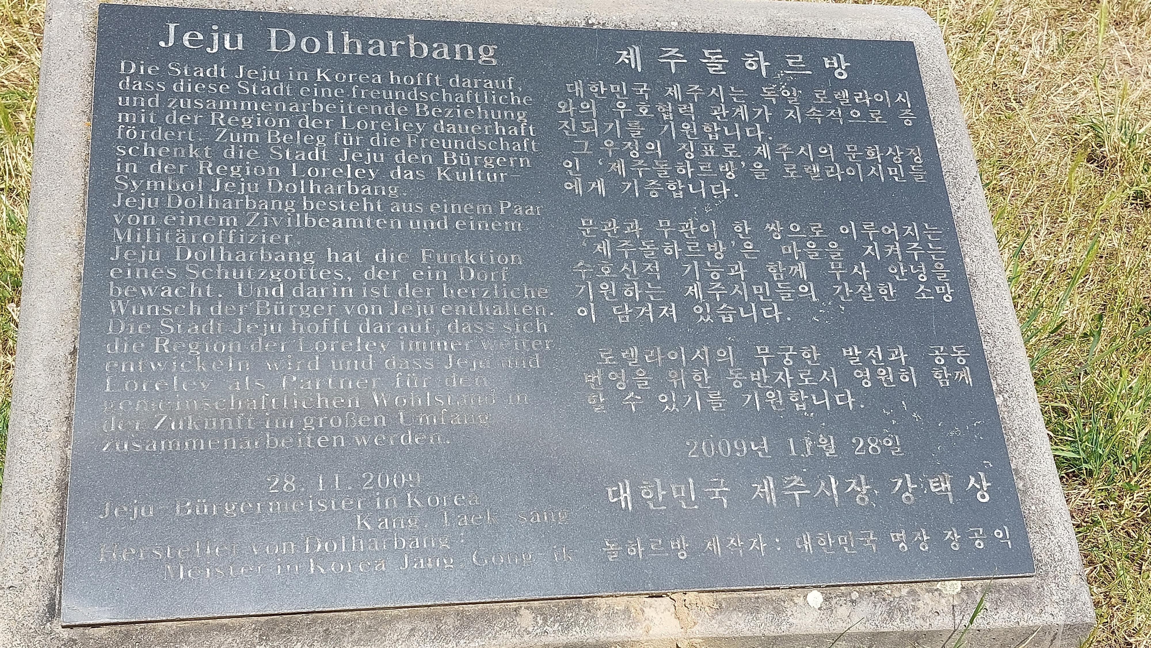Auf der mythischen Loreley stehen zwei beeindruckende Steinfiguren – die Dolharbang. Diese außergewöhnlichen Skulpturen sind ein ganz besonderes Geschenk von der südkoreanischen Partnerstadt Jeju. Die Figuren aus vulkanischem Stein symbolisieren Schutz und Dol hareubang bedeutet übersetzt "Steingroßvater".