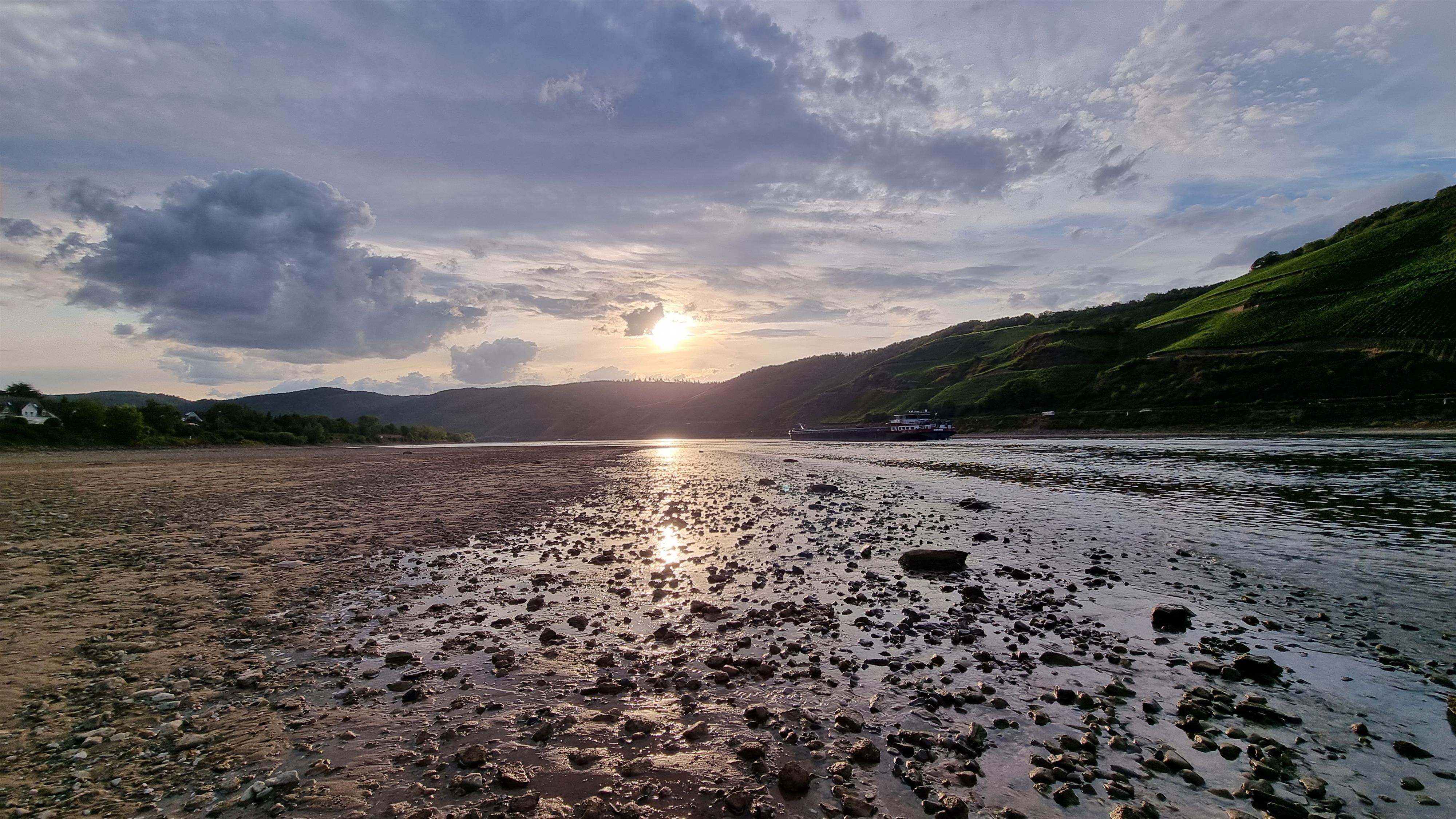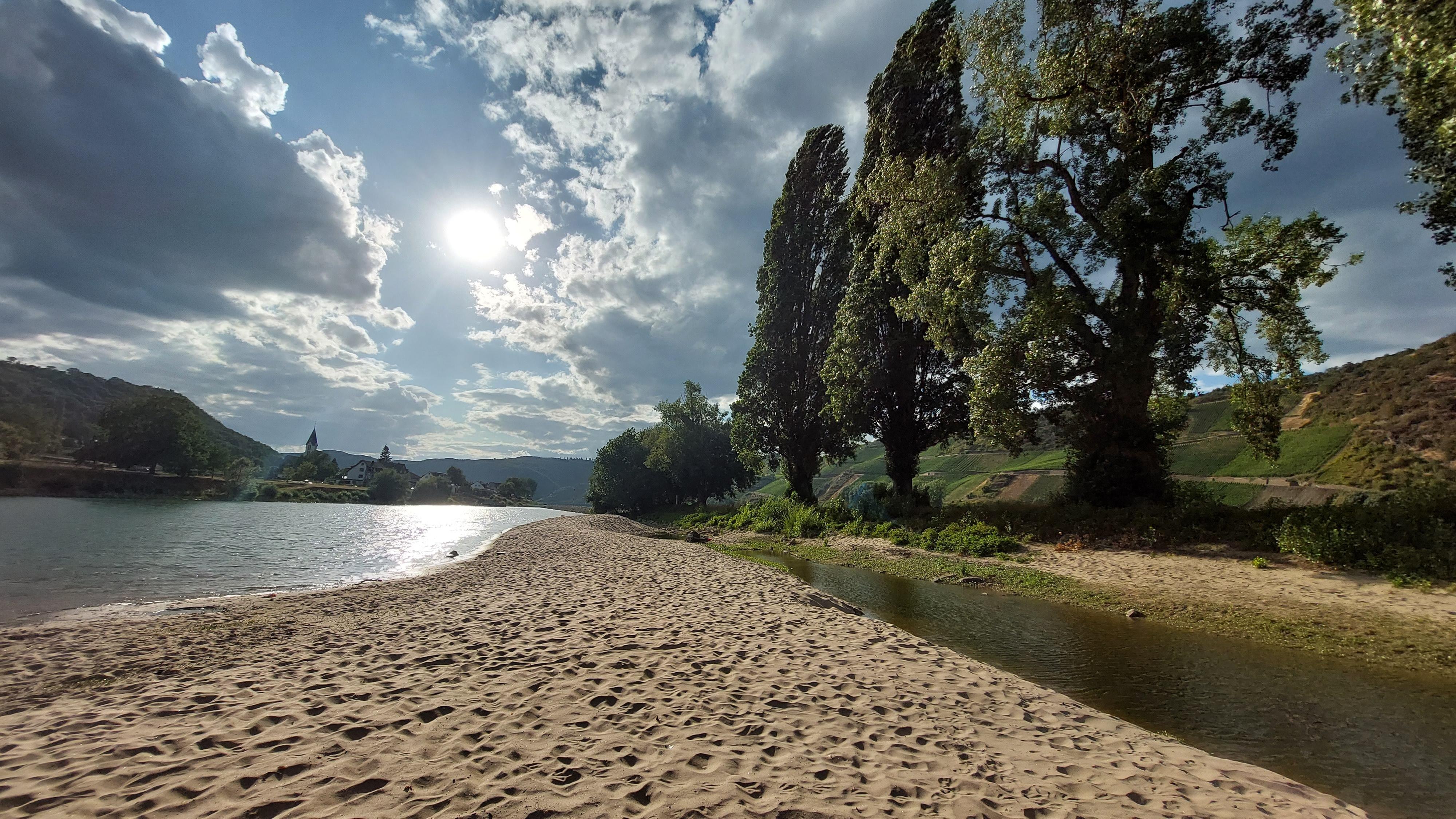 Der feine Rheinsand von Osterspaiern auch "Osterspaier Ritt" genannt, lädt zum Sonnenbaden ein. Im kühlen Nass finden die Beine Erfrischung, während an anderer Stelle ein Angler auf sein Glück wartet, das oft der hier anzutreffende Kormoran schon erfolgreich eingefordert hat.