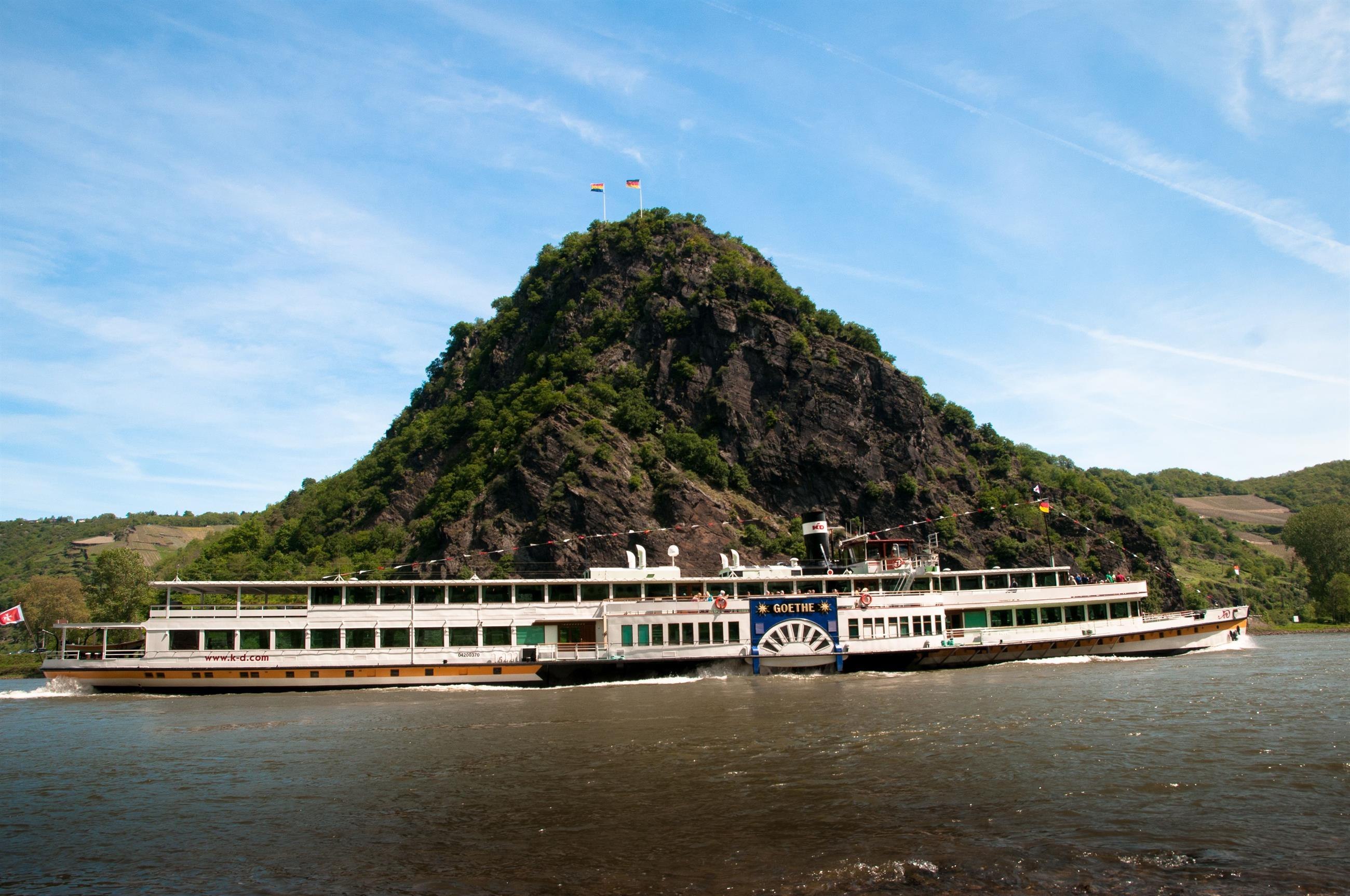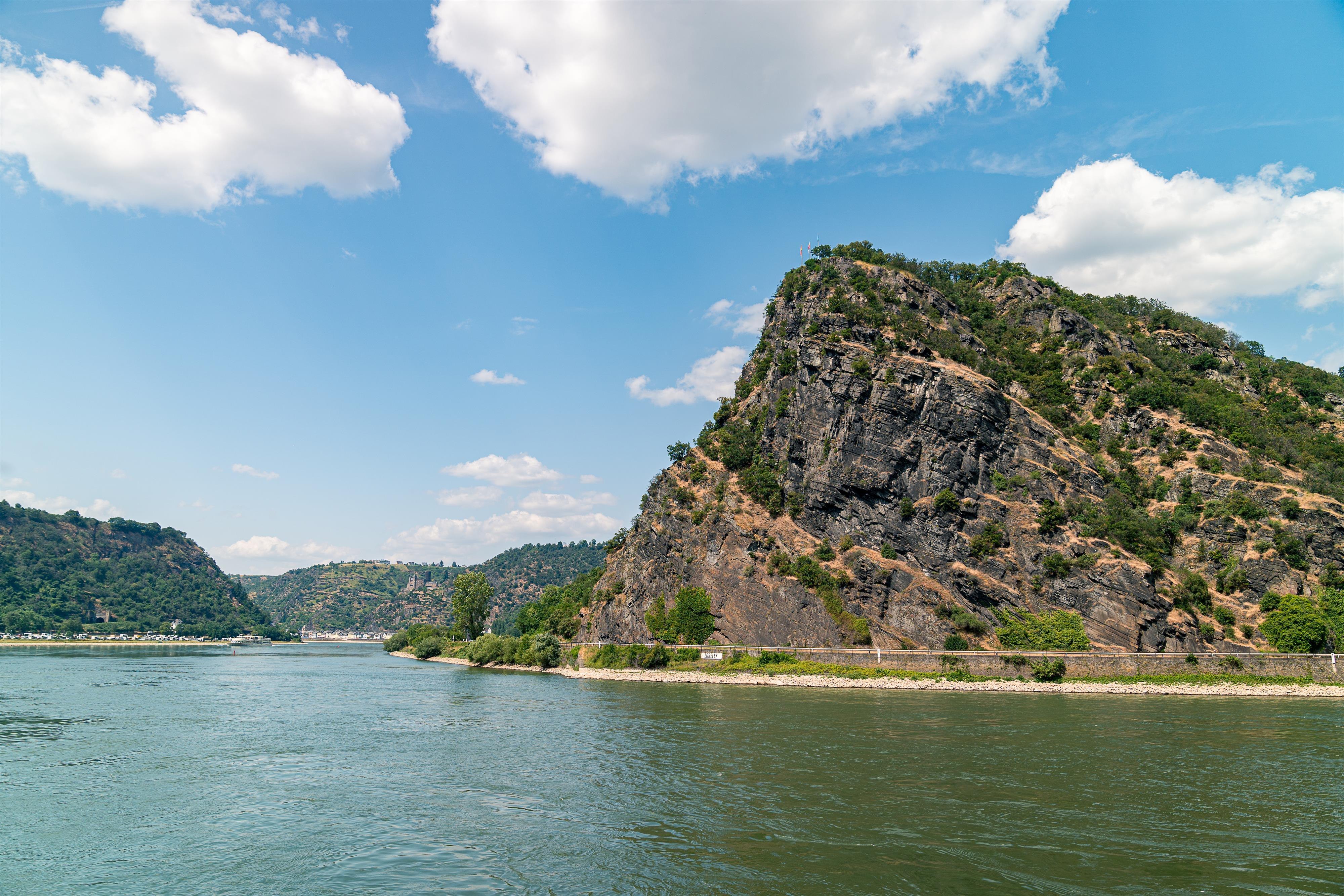 Der 125m hohe Schieferfels (193,14m über n.N) ist geologisch ca. 4 Millionen Jahre alt und seit dem 19. Jahrhundert Mittelpunkt der Rheinromantik. Der Rhein ist hier nur 175 m breit. Entsprechend stark ist hier die Strömung. Eine zusätzliche Gefahr stellten früher die Felsenriffe im Wasser dar, so dass die Schiffe hier großen Gefahren ausgesetzt waren. Viele Schiffe versanken und viele Menschen mußten ihr Leben lassen. Das Wort Loreley entstammt den Worten "Ley"=Felsen und "Loren"= Lauschen. Dies wurde vermutlich abgeleitet vom Rauschen der Stromschnellen und dem Summen des mehrfachen Echos im engen Talabschnitt.
