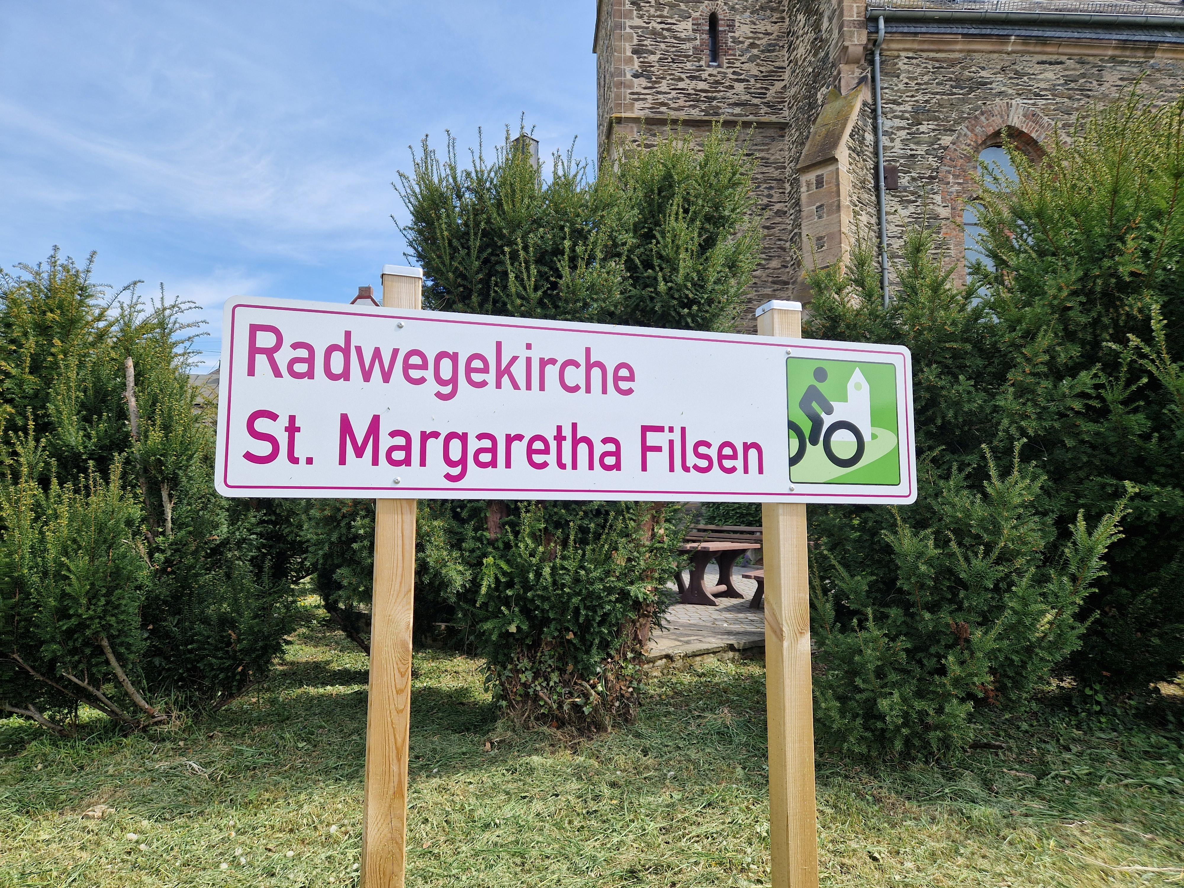 Die Radwegekirche liegt unmittelbar am Rheinradweg in Filsen.
