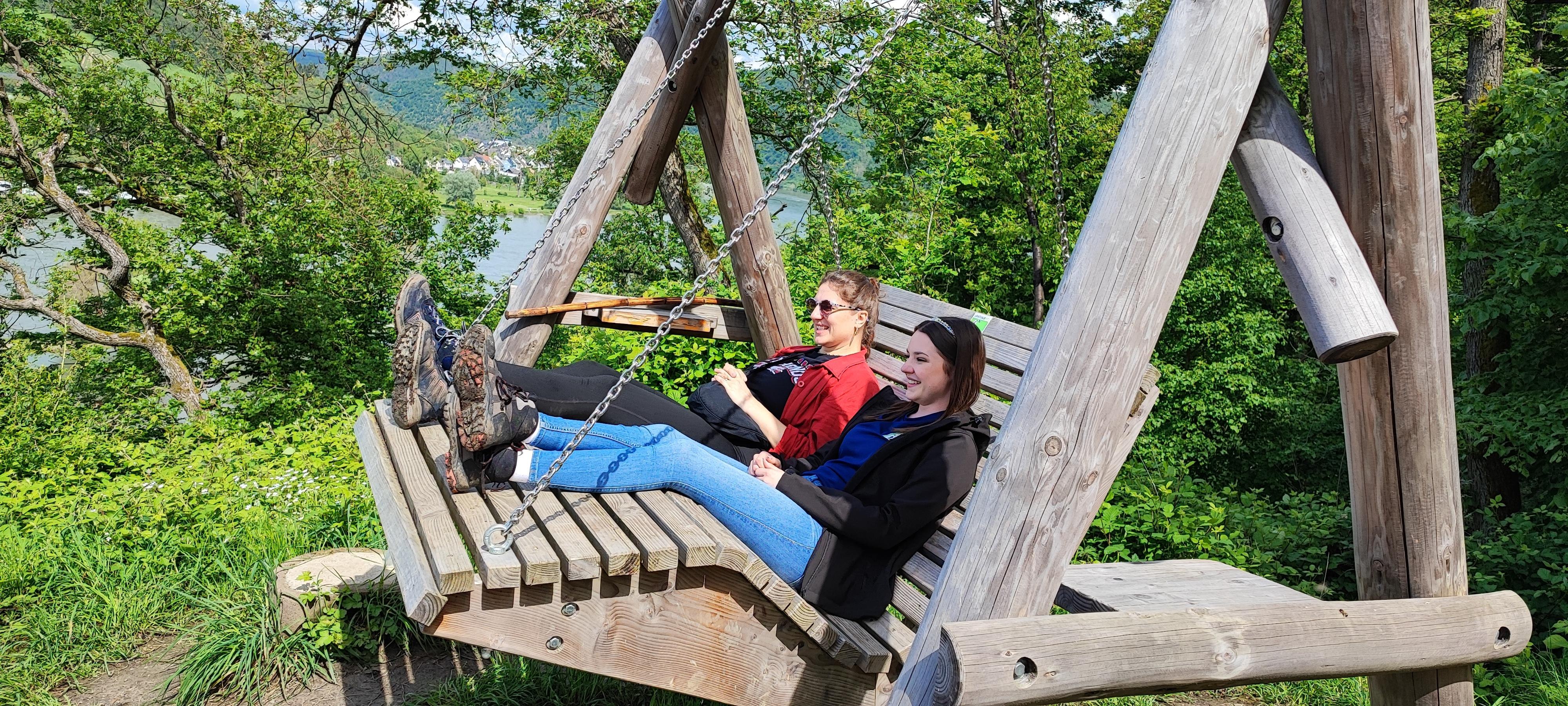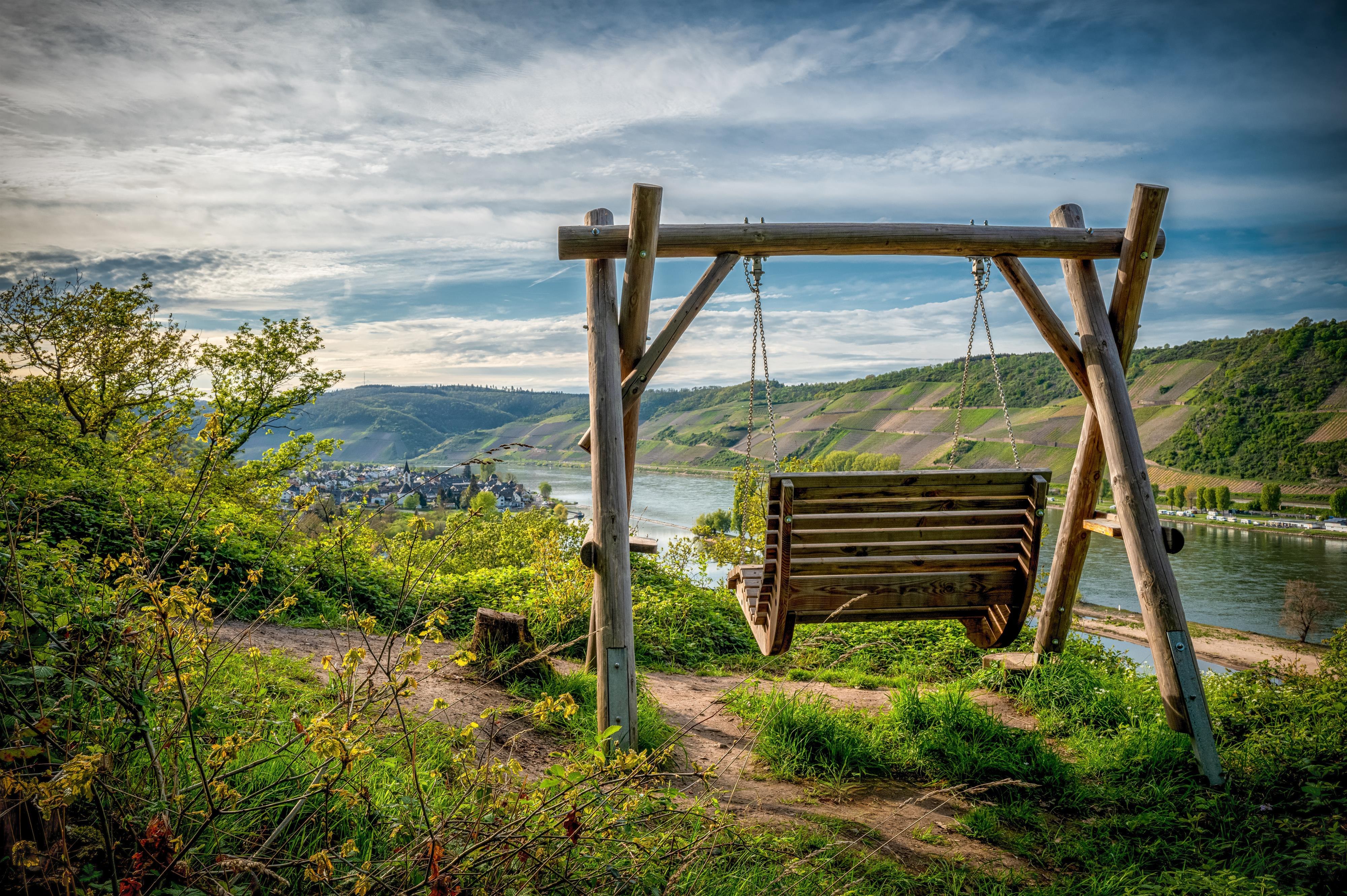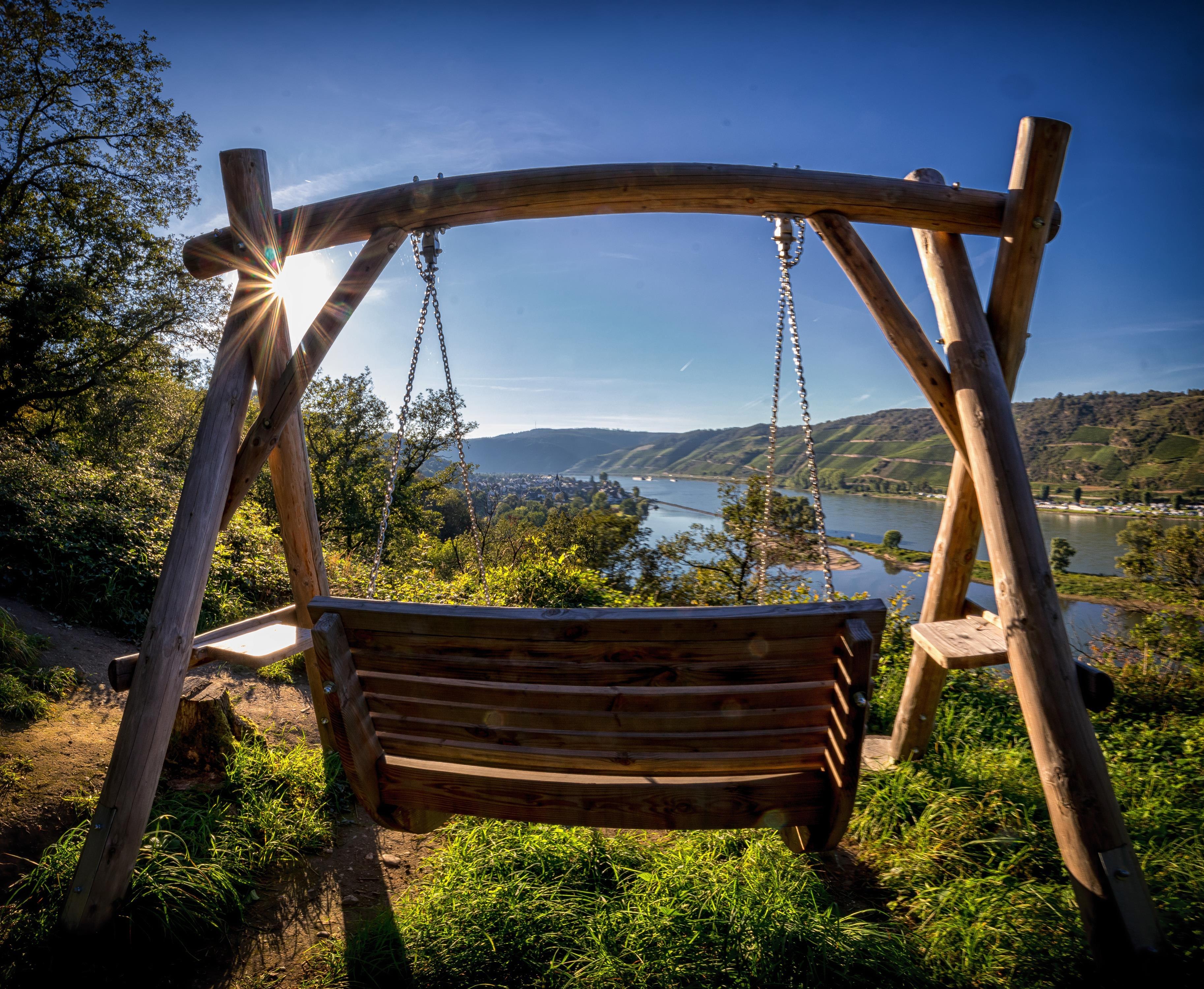 Die Rheinschaukel ist ein Highlight auf dem Langhalsweg, l der 2024 zu "Deutschlands schönsten Wanderweg" gewählt wurde. Auf der Schaukel genießt man einen traumhaften Blick, dort wo der Rhein von West gen Osten fließt.