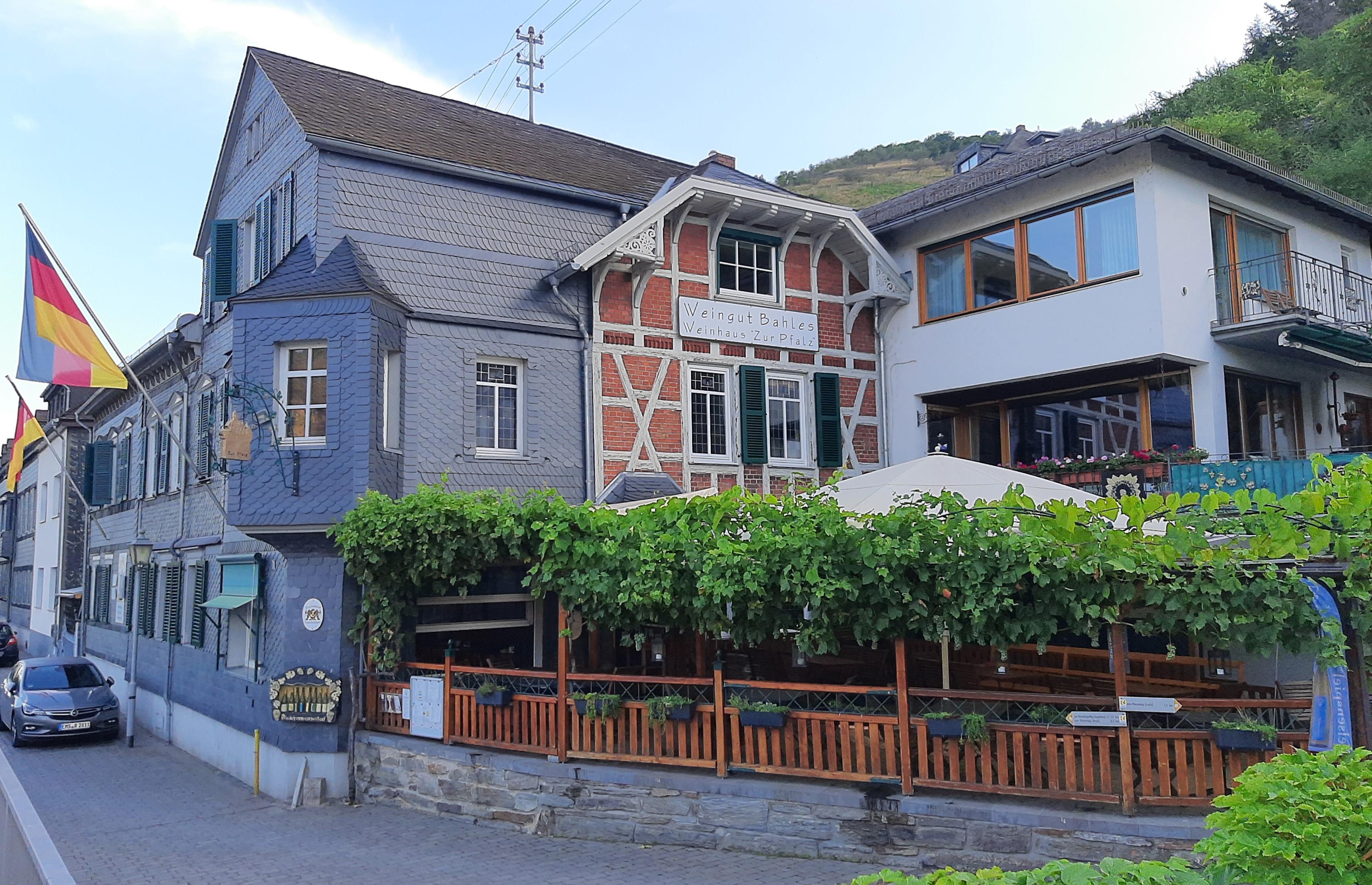 Im Weinhaus Bahles auch "Weinhaus zur Pfalz" genannt (wegen dem Blick vom Lokal / Terrasse direkt auf die Burg Pfalzgrafenstein) werden seit 1876 Gäste bewirtet. Seit 1912 von der Familie Bahles geführt, gehören heute auch 3ha Steillagenweinbau und eine eigene Brennerei dazu. Das Team vom Weinhaus / Weingut Bahles bietet Ihnen regionale Gerichte passend zu den eigenen Weinen. Vom klassischen Spundekäs´ bis zur gebratenen Blutwurst. Aber auch vegetarische Gerichte oder "Mitbringsel" aus anderen Weinbauregionen wie z. B. überbackene Maultaschen oder Flammkuchen werden für Sie zubereitet. Wir freuen uns auf Ihren Besuch!