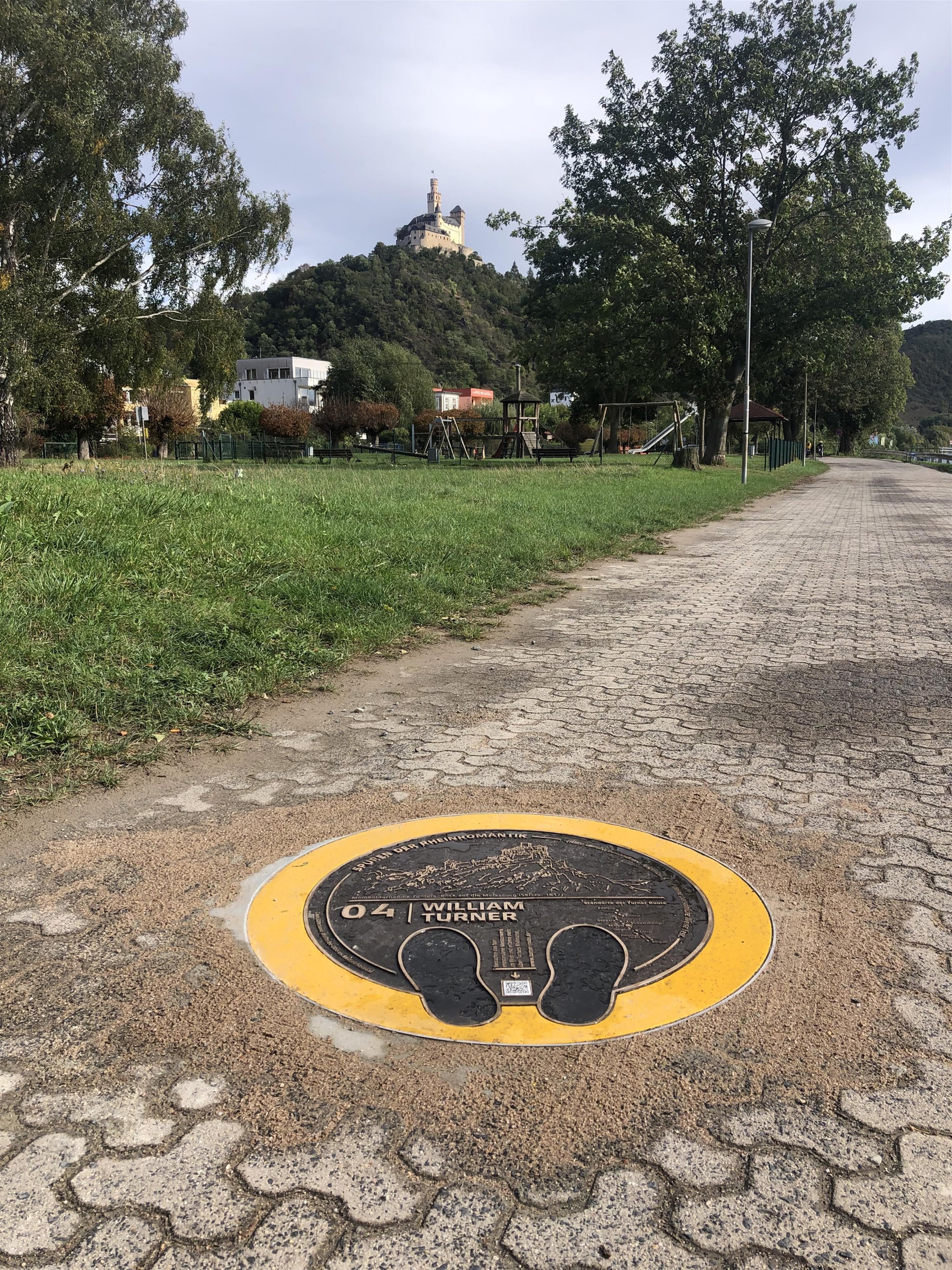 Von Lahnstein kommend zeigt sich Turner kurz vor Braubach diese wunderbare Aussicht auf die Marksburg. Turner blickte vom Ufer aus hinauf zur Anhöhe und hielt den Anblick in einigen Skizzen fest. Das Aquarell selbst entstand erst um 1820 – drei Jahre nach seiner Reise. Im Zentrum des Bildes ist die Marksburg zu erkennen, die von mächtigen Felsen und grünen Bäumen eingerahmt wird. Im Vordergrund werden sich ausruhende Menschen gezeigt, der Fluss lässt sich nur erahnen. Mit dem Fährschiff überquert er erneut den Rhein, um an diesem Tag noch bis nach St. Goar zu wandern. Die Marksburg befindet sich heute im Besitz der Deutschen Burgenvereinigung und kann besichtigt werden.