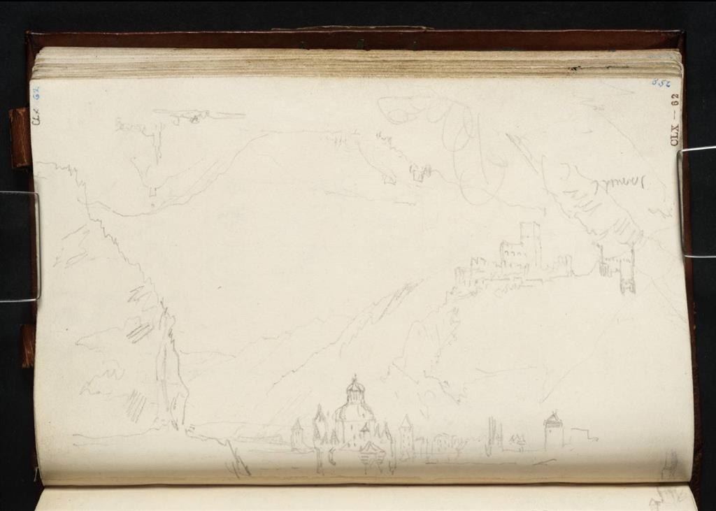Diese Ansicht der »Pfalz bei Kaub« bot sich Turner erst auf seiner Rückreise von Mainz nach Köln am 27. August 1817. Vom Schiff aus skizziert er die ehemalige Zollburg auf der kleinen Flussinsel mit Burg Gutenfels auf der rechten Anhöhe. Die vielen Zeichnungen, die Turner auch schon während seines Fußmarschs angefertigt hatte, zeigen seine Faszination für dieses außergewöhnliche Bauwerk. In diesem Motiv kombiniert er mehrere Bleistiftskizzen zu einer heiteren Gesamtkomposition. Es ist eine der wenigen Burganlagen des Mittelrheintals, die nicht von der napoleonischen Armee zerstört wurde. Die Pfalzgrafenstein ist heute im Besitz des Landes Rheinland-Pfalz und kann besichtigt werden.